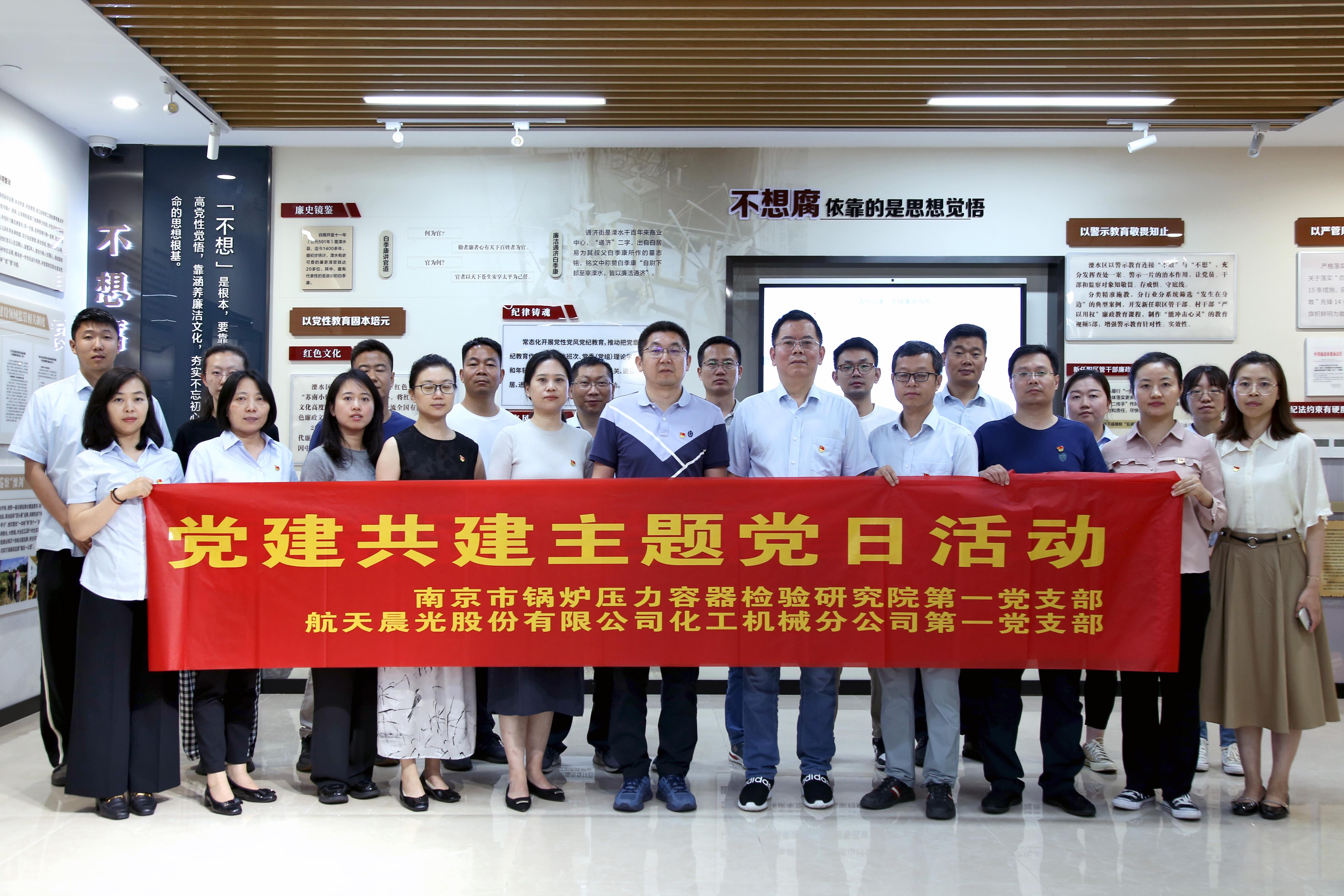 近日,航天晨光化機分公司第一黨支部聯合南京市鍋爐壓力容器檢驗研究院第一黨支部開展“明黨紀、倡廉潔、促發展”黨建共建活動。分公司黨委書記、副總經理儲志軍,黨委副書記、總經理毛長鈞,黨委委員、副總經理張少勇,第一黨支部全體委員,黨委辦公室人員及部分黨員代表參加了本次活動。